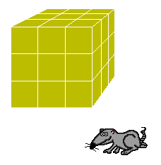 | 20. | Suppose 27 identical cubical chunks of cheese are piled together to form a cubical stack, as illustrated to the right. What is the maximum number of these cheese chunks through which a mouse of negligible size could munch before exiting the stack, assuming that the mouse always travels along the grid of 27 straight lines that pass through the centers of the chunks parallel or perpendicular to their sides, always makes a 90 degree turn at the center of each chunk it enters, and never enters any chunk more than once? | ![]() |