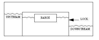 | 15. | A certain lock for raising and lowering barges from one river level to another is a rectangular parallelepiped 200 meters long, 50 wide, and 20 deep. A barge is floating in the lock that is also a rectangular parallelepiped measuring 80 meters long, 25 wide, and 5 deep. The barge, containing 3,000 barrels of toxic chemicals, displaces 8,000 long tons of water. The water has a density of one long ton per cubic meter. Each barrel is watertight, with a volume of one cubic meter and a weight of two long tons. A group of terrorists render the lock inoperable and attach a time bomb to the side of the barge set to go off in three hours. The barge contains elevators for moving barrels quickly to the deck, but the crew is too shorthanded to roll the heavy barrels up an inclined plane in the time allotted. The deck is only ten centimeters below the top edge of the lock, from which the barrels could be rolled to dry land. If no water is entering or leaving the lock, how many barrels at a minimum would have to be rolled into the water in the lock in order to raise the level of the barge so that its deck would be even with or slightly above the top edge of the lock so that the remaining barrels can be rolled to dry land? | |